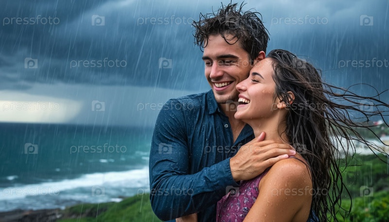 Влюбленная пара, парень и девушка, целуются и обнимаются на берегу моря во время шторма и грозы