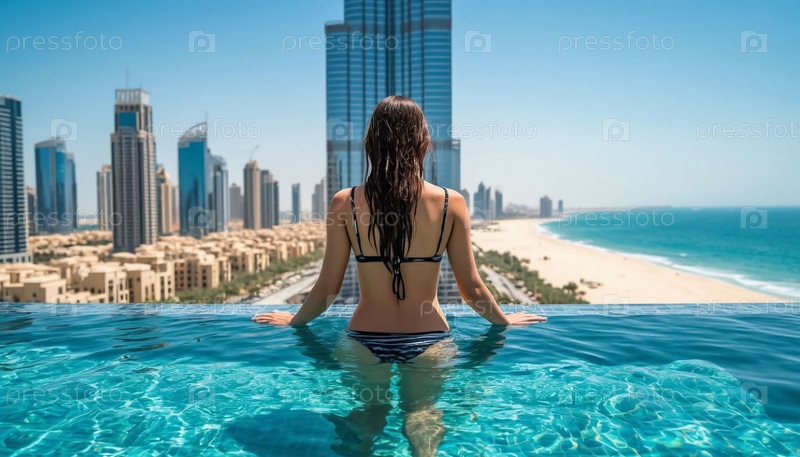 Девушка на краю бассейна с бесконечностью на крыше небоскреба