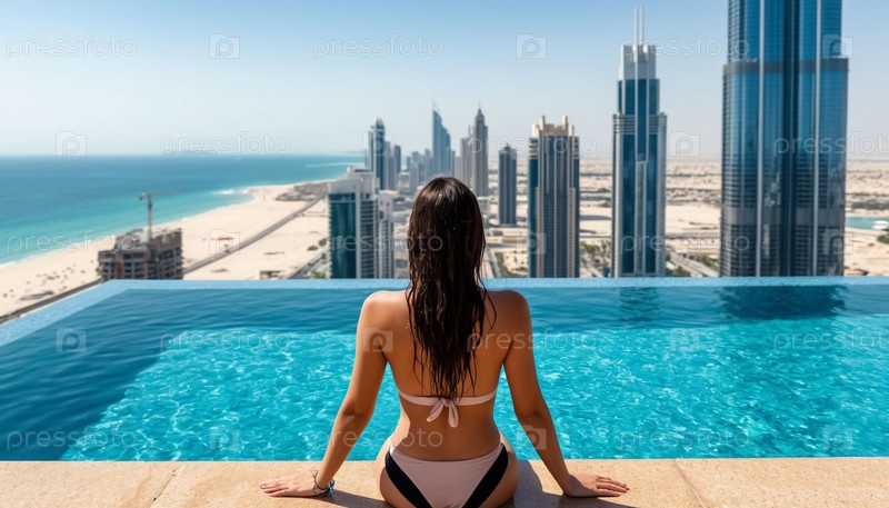 Девушка на краю бассейна с бесконечностью на крыше небоскреба