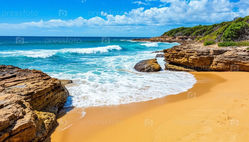 Небольшой дикий пустынный пляж, желтый песок, прозрачные голубые волны, лето