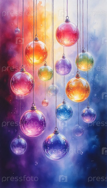 Рождественский радужный фон с висящими стеклянными сферами