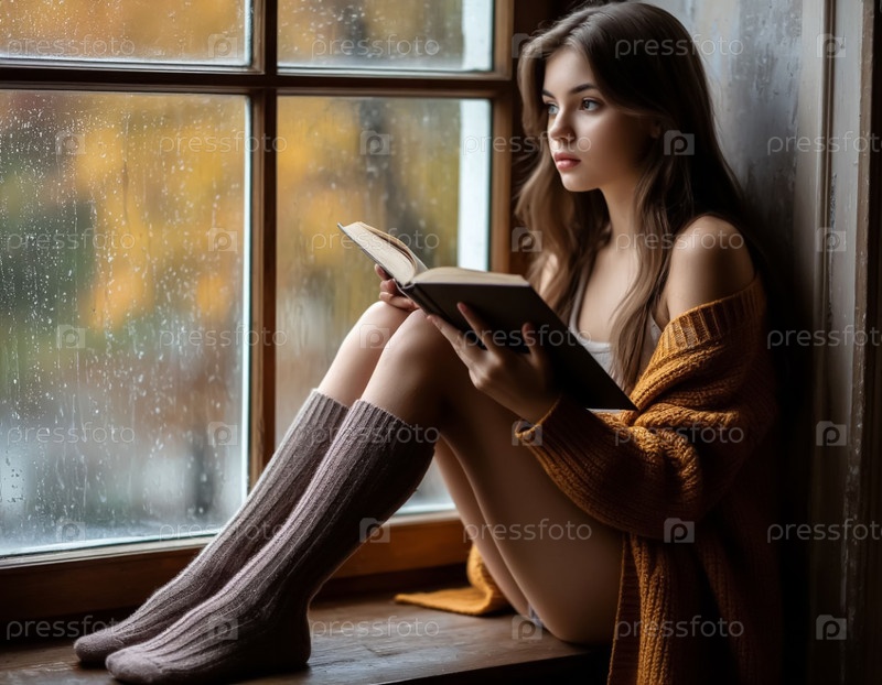 Цифровая иллюстрация девочки с книгой, сидящей на окне во время дождя
