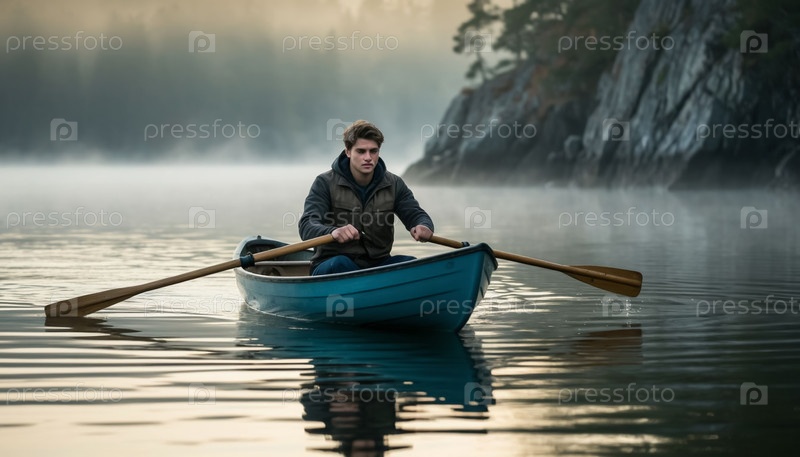 Молодой человек один в лодке посреди туманного озера