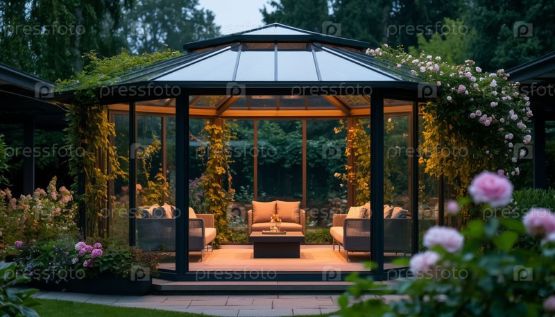 Современная стеклянная беседка в цветущем саду