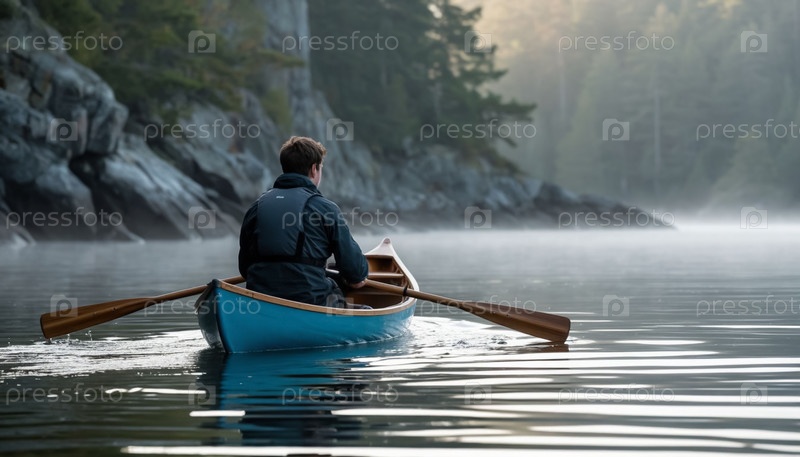Молодой человек один в лодке посреди туманного озера
