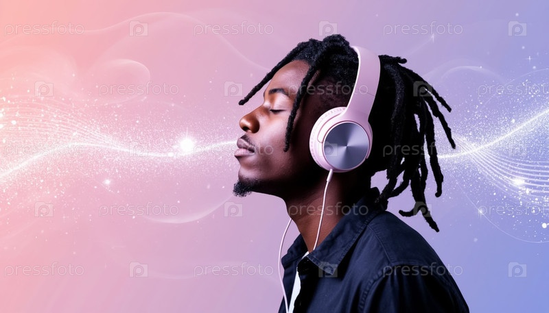 Чернокожий парень с дредушками слушает музыку в наушниках на пастельном фоне со звуковыми волнами. Музыкальная обложка альбома, джаз
