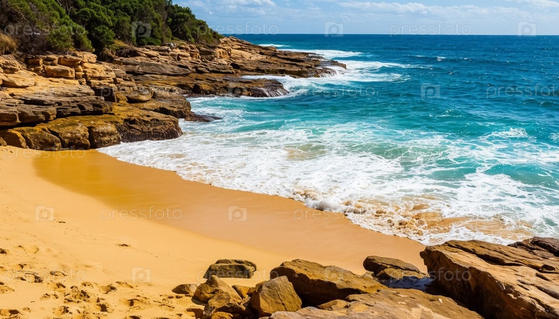 Небольшой дикий пустынный пляж, желтый песок, прозрачные голубые волны, лето