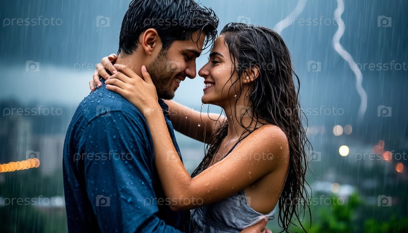 Влюбленная пара, парень и девушка в ночном городе целуются и обнимаются во время дождя и грозы