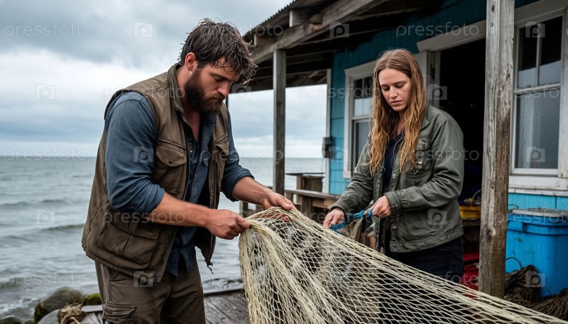 Супружеская пара, рыбак и его жена, вытаскивают сети с рыбой на берегу моря