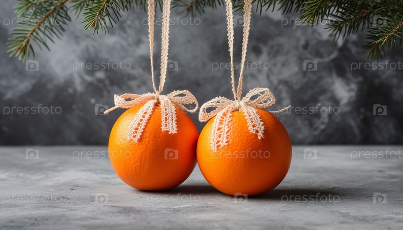 Апельсины украшены кружевками и кружками на Рождество, а фон - копировальным пространством