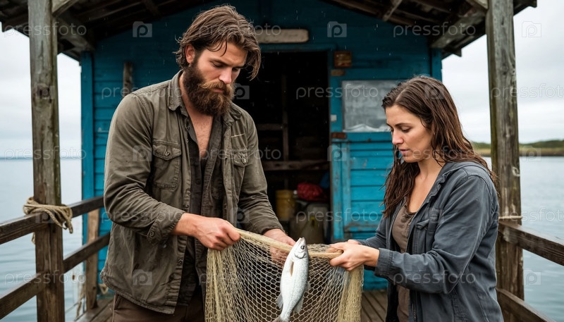 Супружеская пара, рыбак и его жена, вытаскивают сети с рыбой на берегу моря