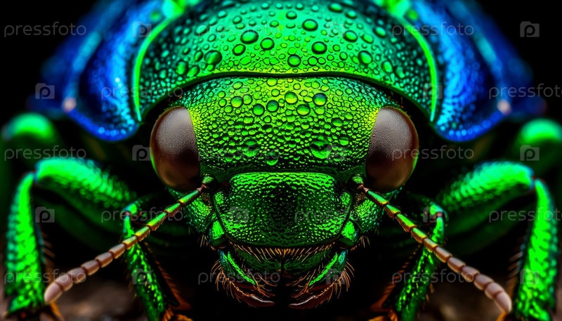 Гипердетальный изумрудовый жук с капельками росы