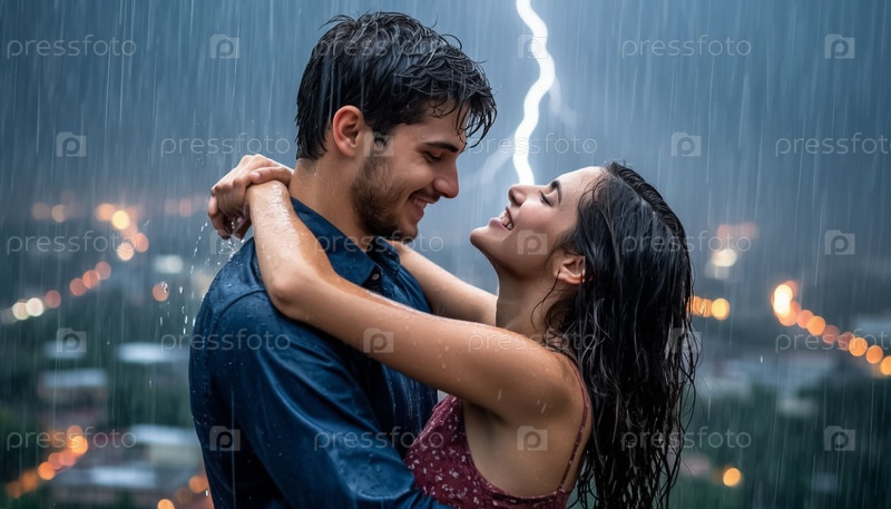Влюбленная пара, парень и девушка в ночном городе целуются и обнимаются во время дождя и грозы