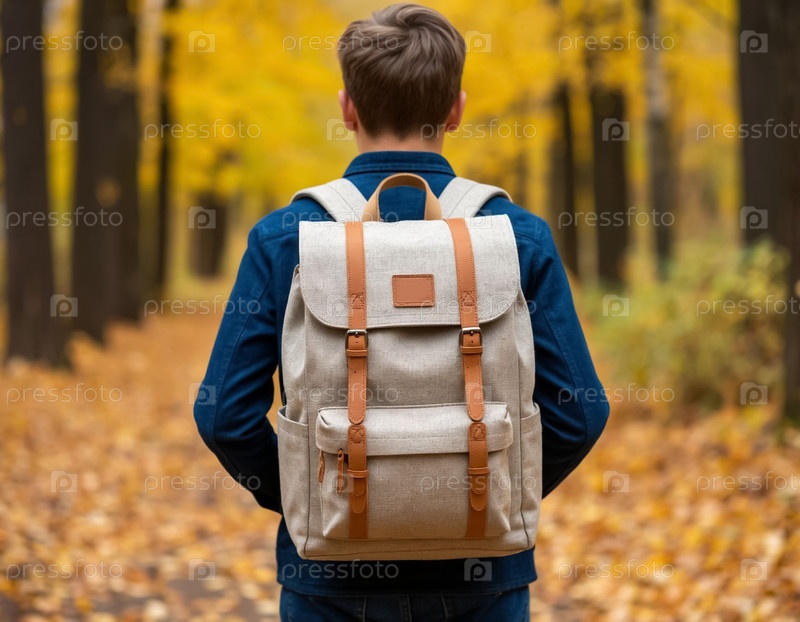 Студент с полотном рюкзаком гуляет в осеннем парке - спокойный задний вид на сезонное одиночество