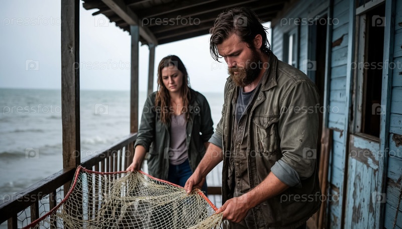 Супружеская пара, рыбак и его жена, вытаскивают сети с рыбой на берегу моря