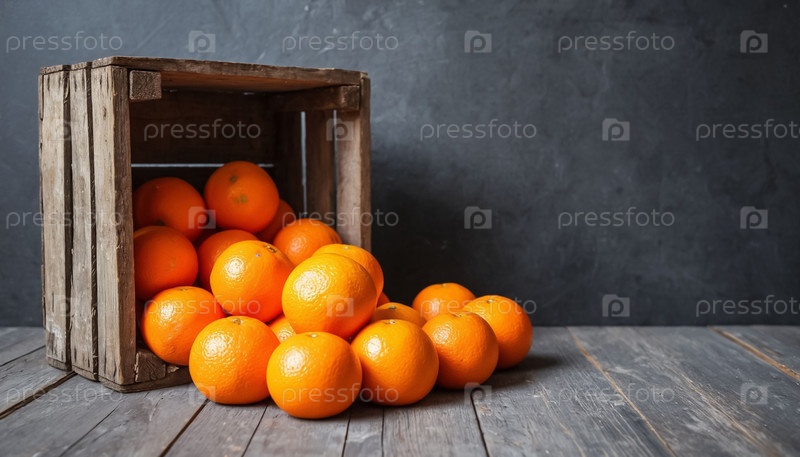 Зрелые мандарины в деревянном ящике на серой стене - рустичная сезонная свежесть с минималистическим контрастом