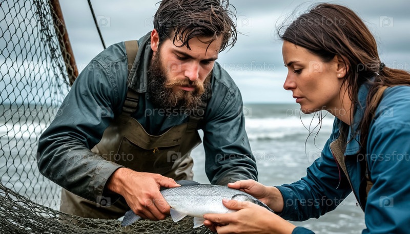 Рыбак и его жена вытаскивают сети с рыбой на берегу моря в бурную погоду