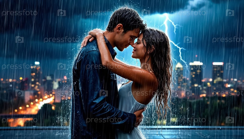 Влюбленная пара, мужчина и женщина в ночном городе целуются и обнимаются во время дождя и грозы