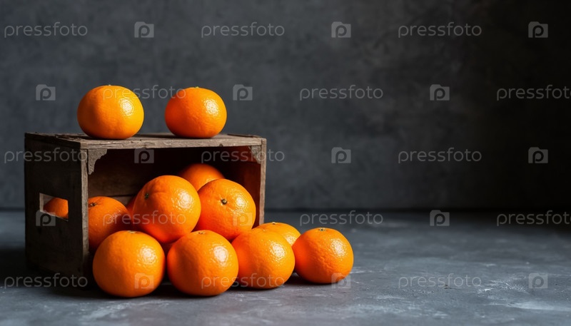 Зрелые мандарины в деревянном ящике на серой стене - рустичная сезонная свежесть с минималистическим контрастом