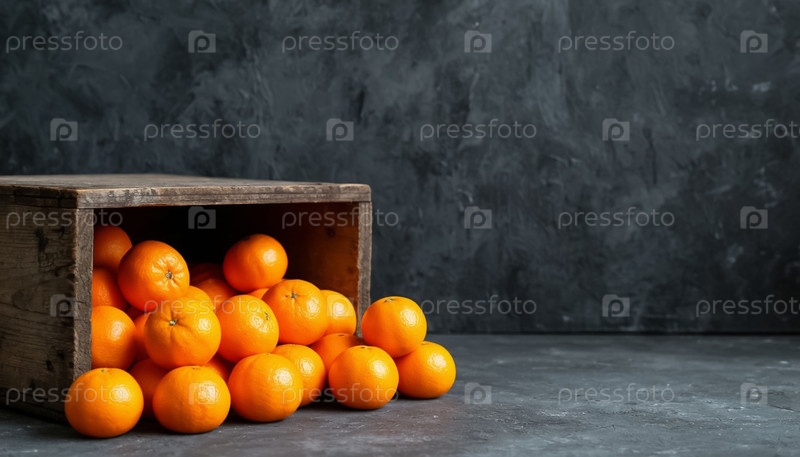 Зрелые мандарины в деревянном ящике на серой стене - рустичная сезонная свежесть с минималистическим контрастом