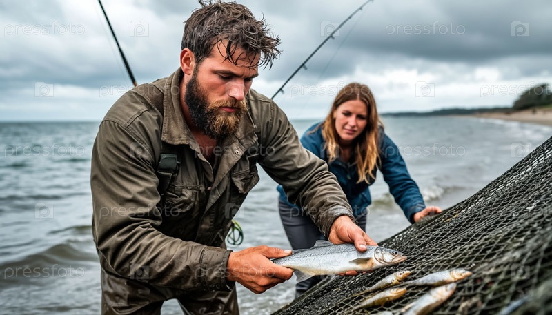 Рыбак и его жена вытаскивают сети с рыбой на берегу моря в бурную погоду