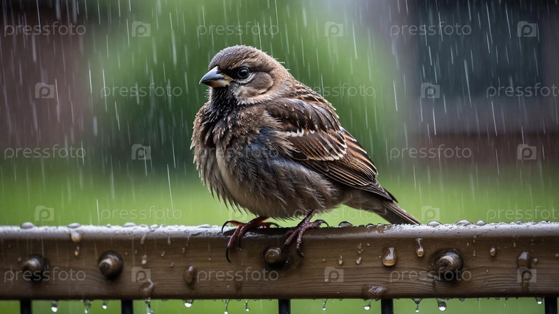 Мокрый воробьик, сидящий под дождем атмосферный портрет животного
