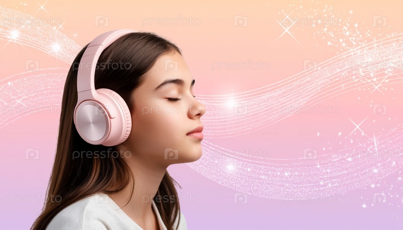 Молодая девушка слушает музыку на наушниках на пастельном фоне с звуковыми волнами. Музыкальная обложка альбома