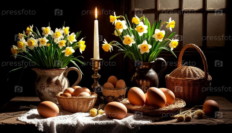 Пасхальный черный натюрморт: драматическое освещение и длинные тени