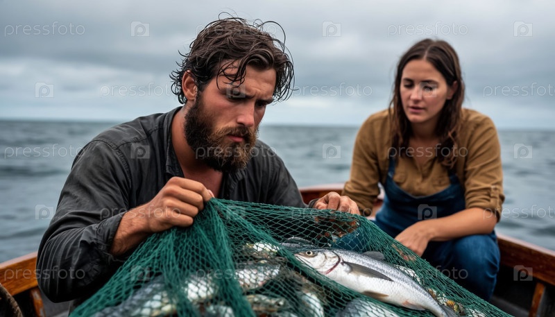 Рыбак и его жена находятся в лодке во время шторма, вытягивая сети с рыбой