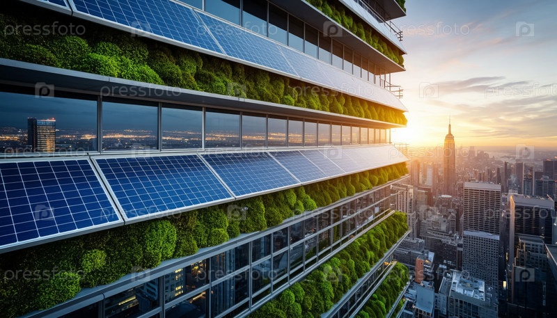Прозрачные солнечные панели на футуристическом небоскребе, светящемся энергией