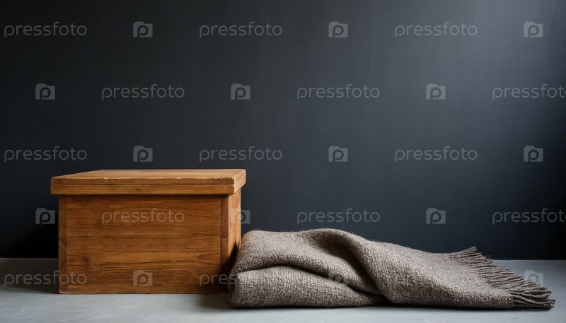 Деревянный ящик и шерстяное одеяло от серой стены - минималистическое деревенское тепло для спокойного интерьера