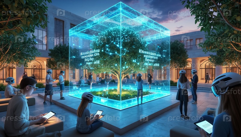 Футуристический глобальный центр знаний с голографическими книгами, нейронными интерфейсами для мгновенного обучения и людьми всех возрастов, имеющими доступ к информации