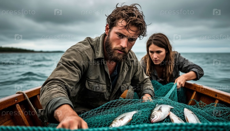 Рыбак и его жена находятся в лодке во время шторма, вытягивая сети с рыбой