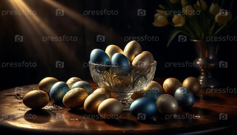 Драматический пасхальный натюрморт, длинные тени и глубокая фокусировка
