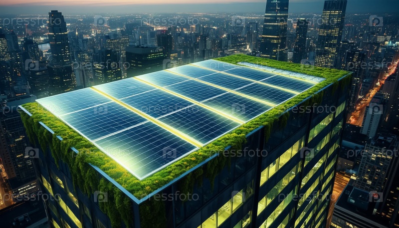 Прозрачные солнечные панели на футуристическом небоскребе, светящемся энергией