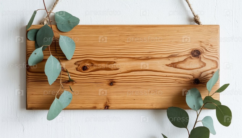 Деревянный пустой знак и ветвь эвкалипта на белой стене