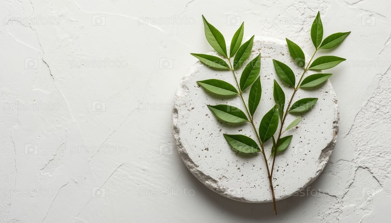 Естественный камень на белом фоне и зелено-белая ветвь