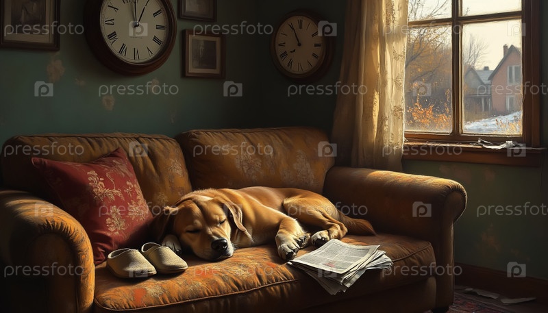 Одинокий питомец на диване с тапочками отсутствует человек