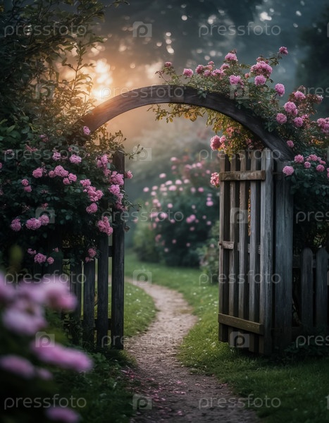 Деревянные ворота в красивый цветущий сад