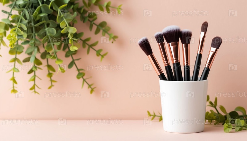 Макияжные кисти в стакане на пастельно-бежевом фоне