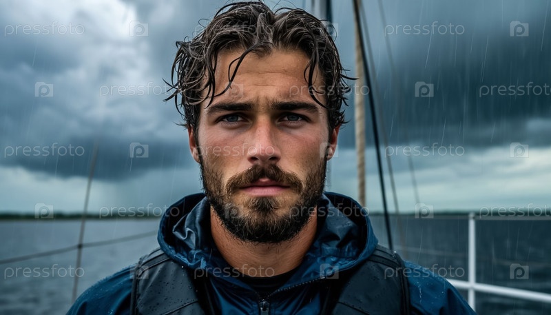 Яхтсмен вблизи во время шторма на море на яхте мужчина