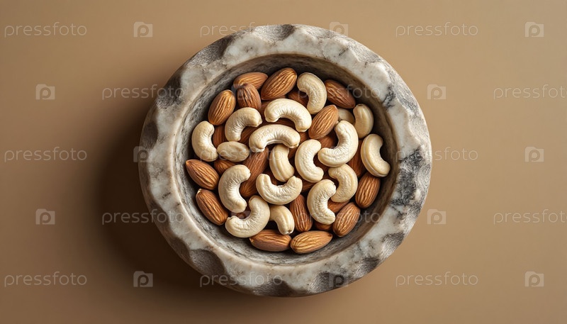 Каменная миска с орехами на теплом бежевом фоне