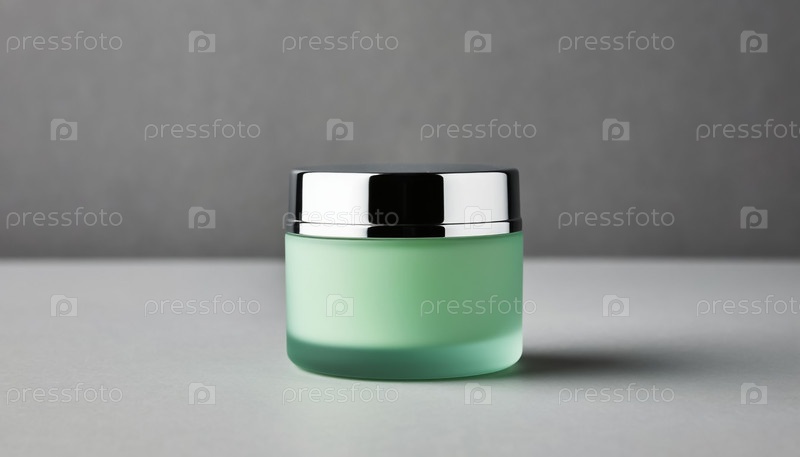 Банка с зеленым кремом женской косметики на сером фоне