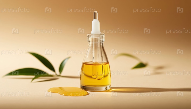 Бутылка с сывороткой гиалуроновой кислоты на пастельно-бежевом фоне.Концепция красоты и молодости для женщин