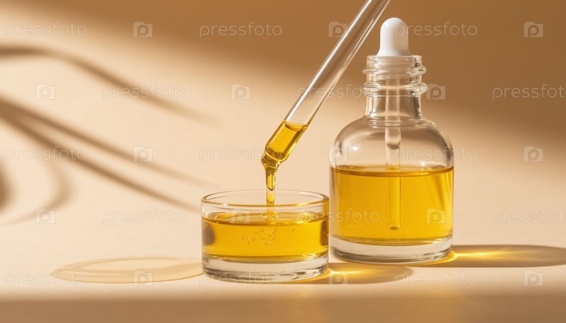 Бутылка с сывороткой гиалуроновой кислоты на пастельно-бежевом фоне.Концепция красоты и молодости для женщин