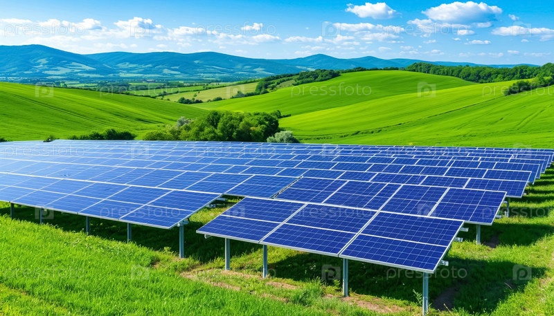 Солнечные батареи установлены на зеленых холмах. чистая зеленая энергия