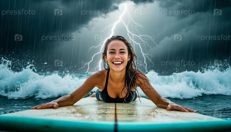 Красивая счастливая девушка с мокрыми волосами в море на доске для серфинга во время грозы и шторма