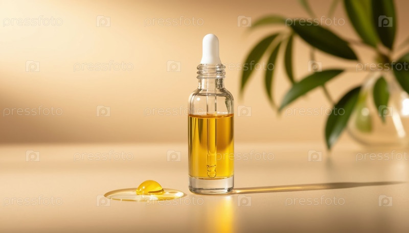 Бутылка с сывороткой гиалуроновой кислоты на пастельно-бежевом фоне.Концепция красоты и молодости для женщин