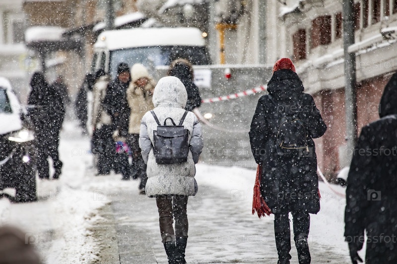 Пешеходы идут по заснеженной городской улице во время снегопада
