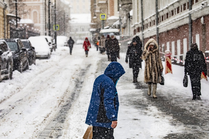 Пешеходы идут по заснеженной городской улице во время снегопада